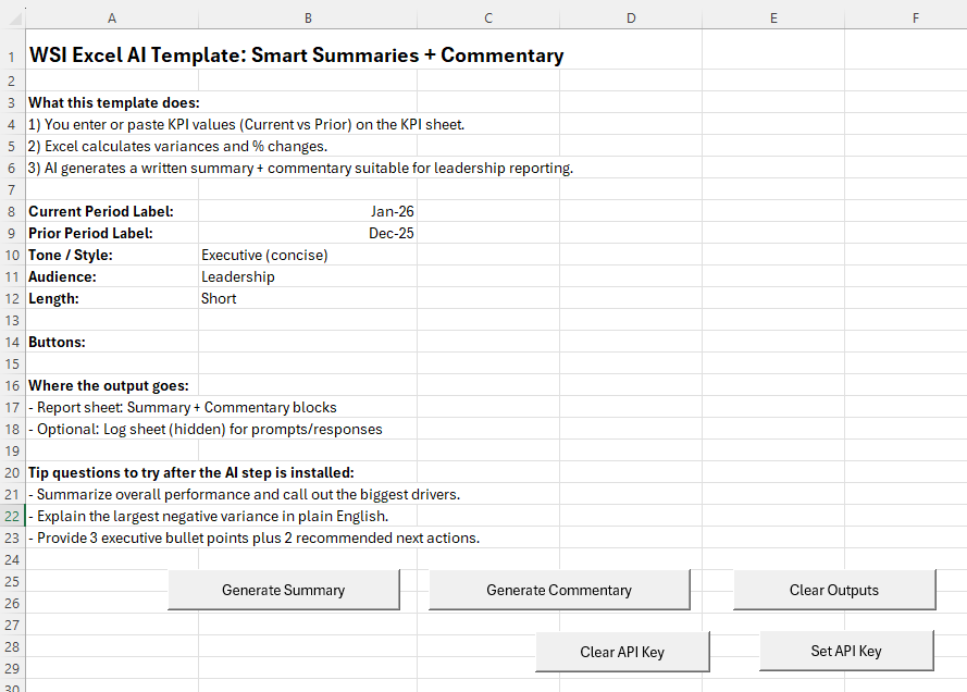 This template is a starting point. In production projects, WSI expands the pattern into your reporting system so the AI commentary aligns with your metrics, your definitions, and your decision-making style—without breaking your existing Excel processes.