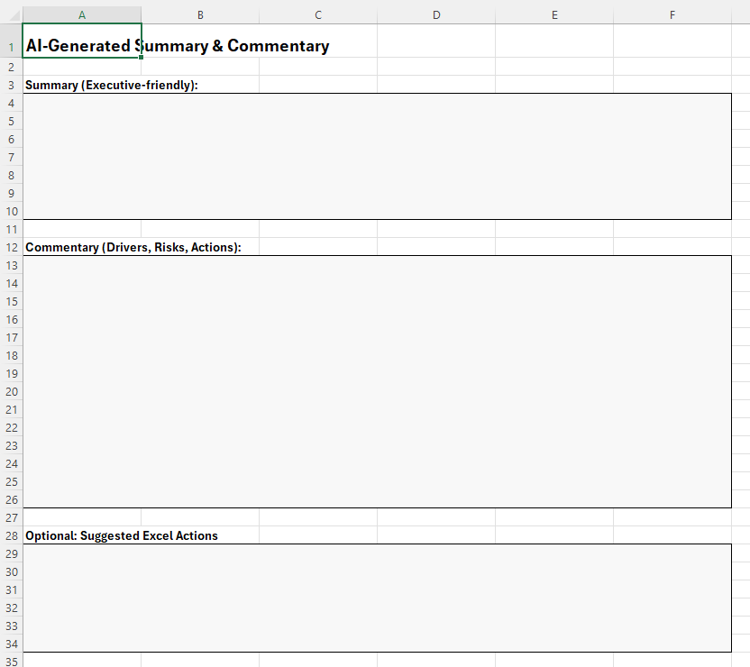 - Power Query + refresh workflows: Generate commentary automatically after refresh, reducing last-minute scrambling before reporting deadlines.
