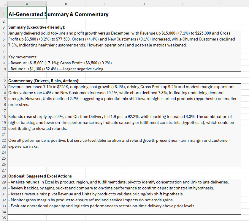 The template demonstrates a production-friendly strategy: Excel remains responsible for the trusted calculations (current values, prior values, variances, percent change), and AI is used for what it does best—turning structured results into clear written explanations. This avoids the “black box” problem while still delivering the time-saving benefits of AI.